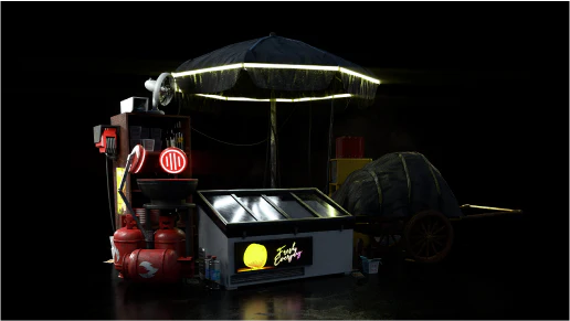 Populate the streets of your Cyberpunk worlds with tons of kiosks, store fronts, food joints, stand-alone machines, random street clutter, radiators, traffic stands, bottles, pans, pots, cans and so much more! This Kit’s larger pieces also have detailed interiors that will work well in any of your sci-fi or dystopian worlds!