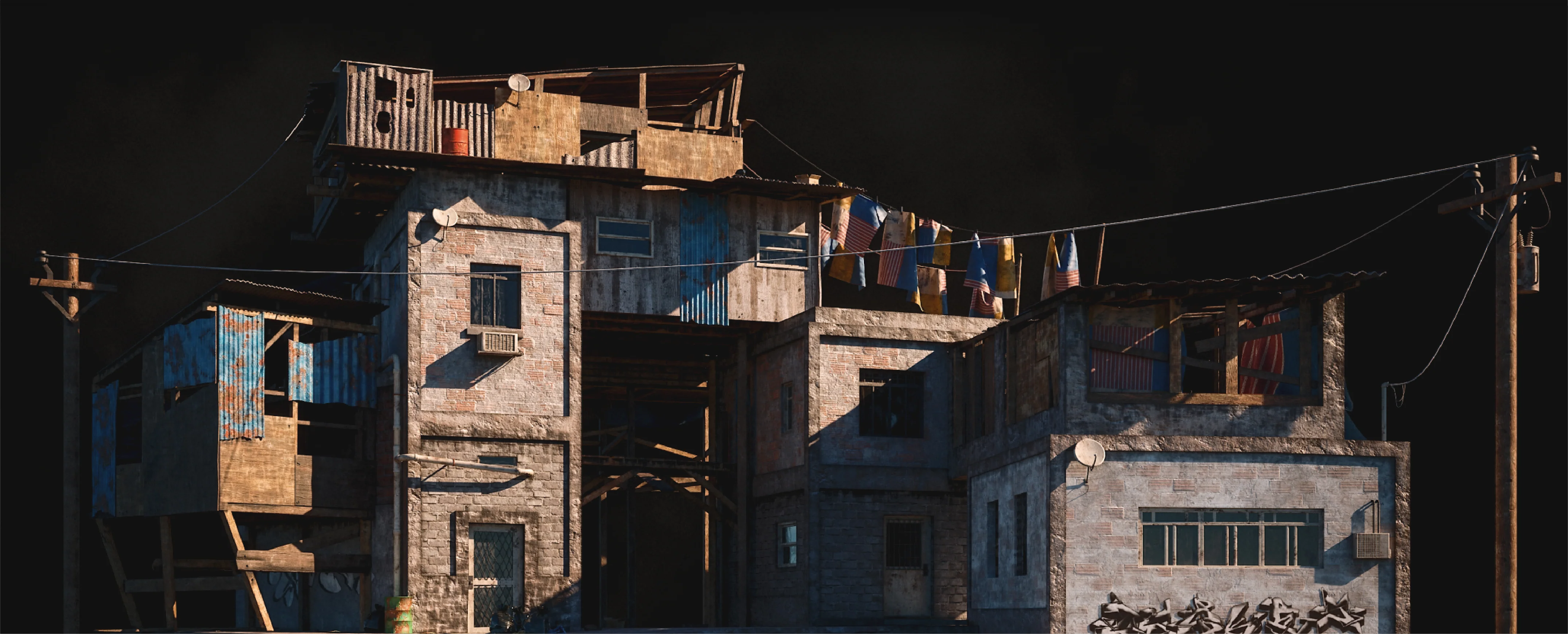 Envision burgeoning post-apocalyptic urban centers with this Kit's enormous catalog of makeshift dwellings, complexes, huts, props, and fixtures. Quickly build your scene with a range of extraordinarily detailed derelict city blocks and embellish them further with corrugated iron, water tanks, folding chairs, and shoddy electrical wiring. Each ramshackle unit is uniquely crafted and infinitely customizable – from the football courtyard to the rickety pier.